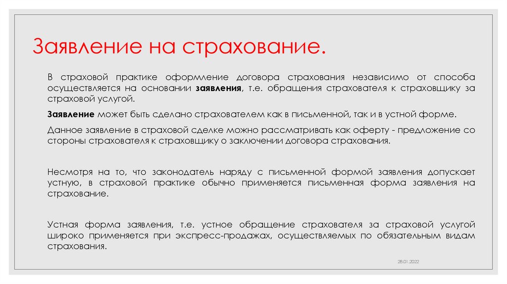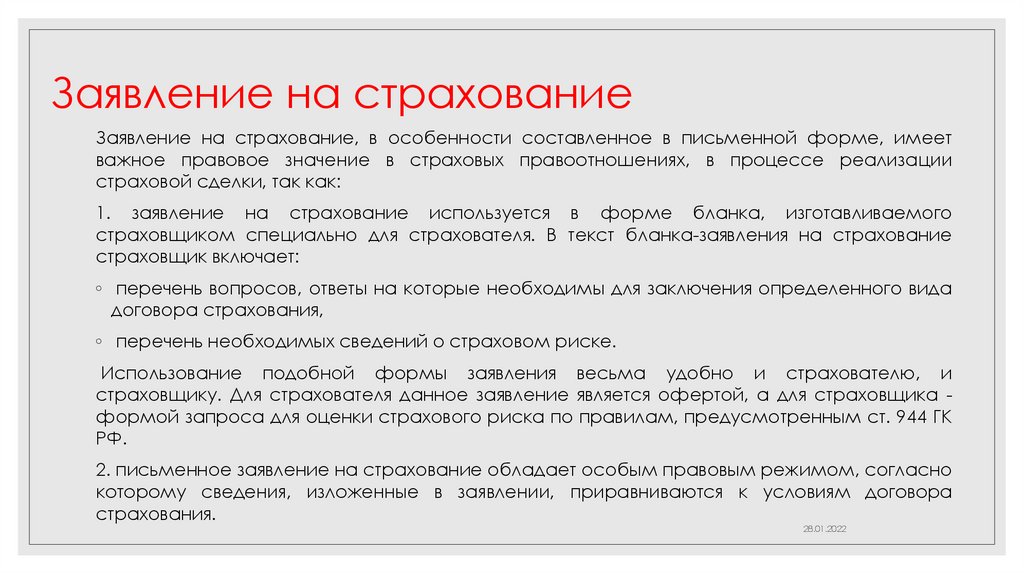 Заявление на страхованиеЗаявление на страхование, в особенности составленное в письменной форме, имеет