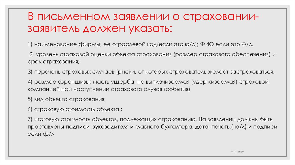 В письменном заявлении о страхованиизаявитель должен указать:1) наименование фирмы, ее отраслевой код(если это ю/л); ФИО если это Ф/л.