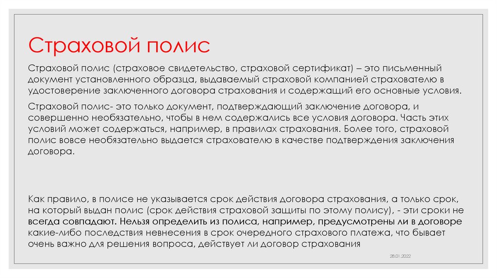 Страховой полис- это только документ, подтверждающий заключение договора, и