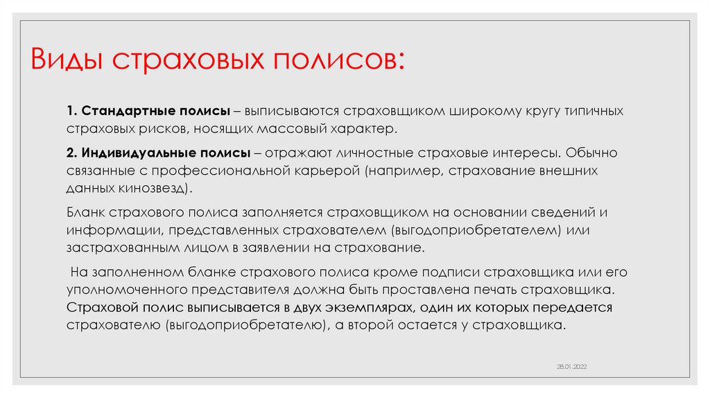 Виды страховых полисов:1. Стандартные полисы – выписываются страховщиком широкому кругу типичных