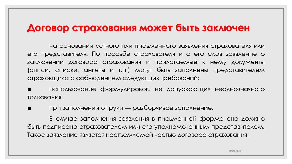 Договор страхования может быть заключенна основании устного или письменного заявления страхователя или