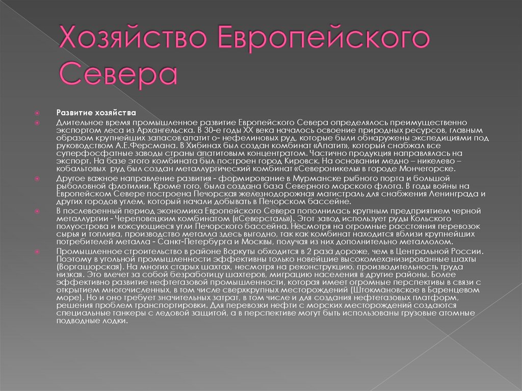 Развитие хозяйстваДлительное время промышленное развитие Европейского Севера определялось преимущественно