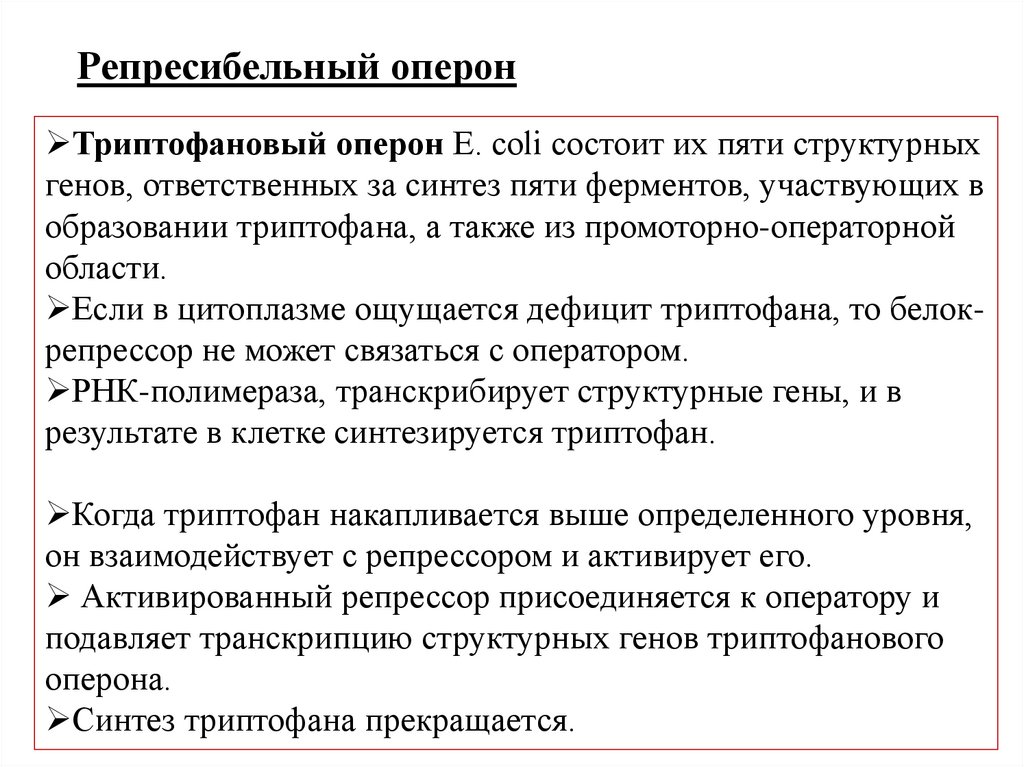 Если в цитоплазме ощущается дефицит триптофана, то белокрепрессор не может связаться с оператором.