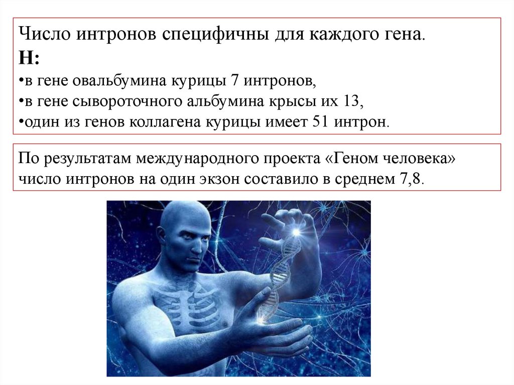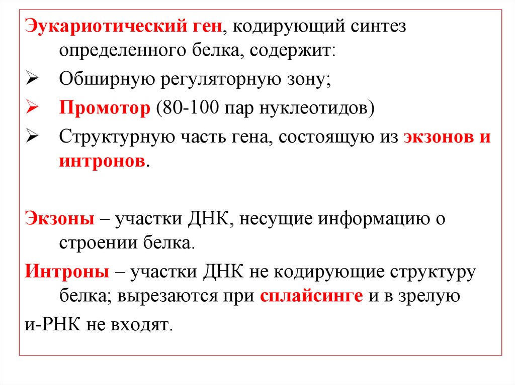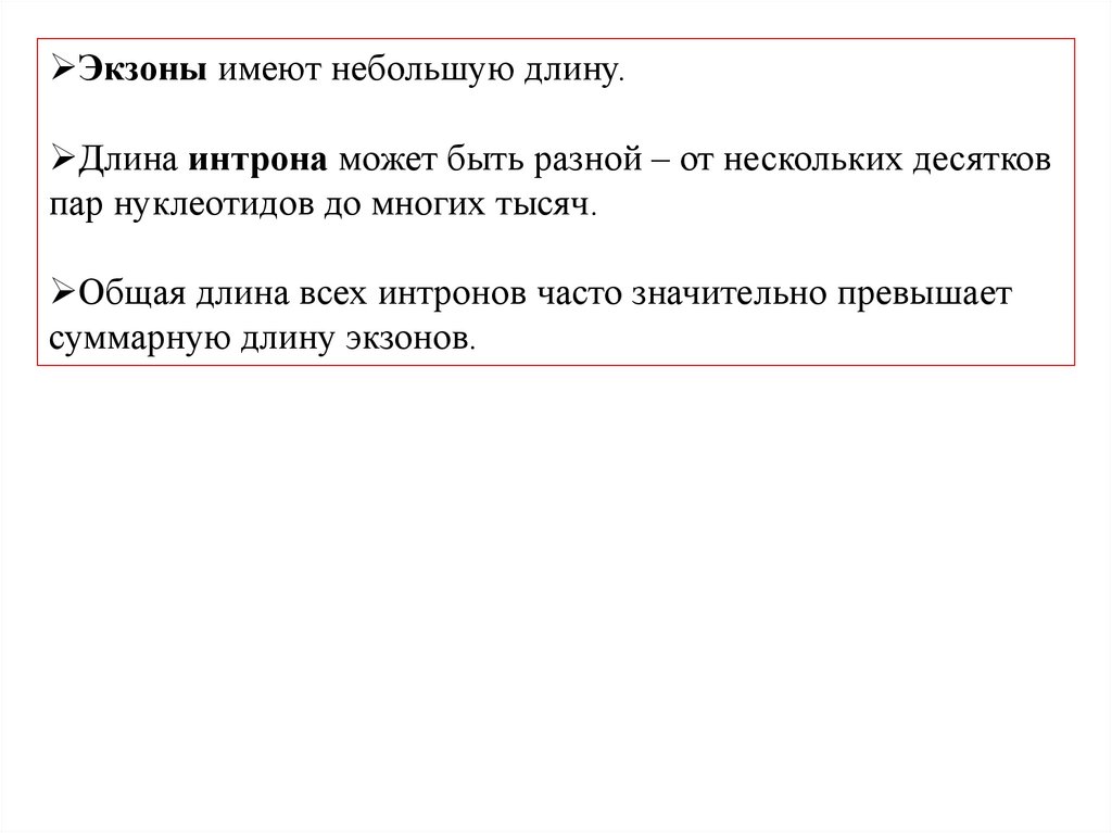 Экзоны имеют небольшую длину.Длина интрона может быть разной – от нескольких десятков