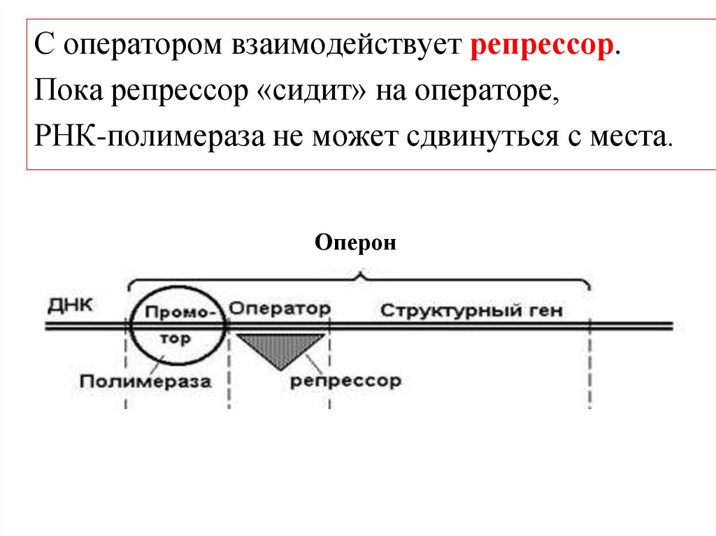 С оператором взаимодействует репрессор.Пока репрессор «сидит» на операторе,