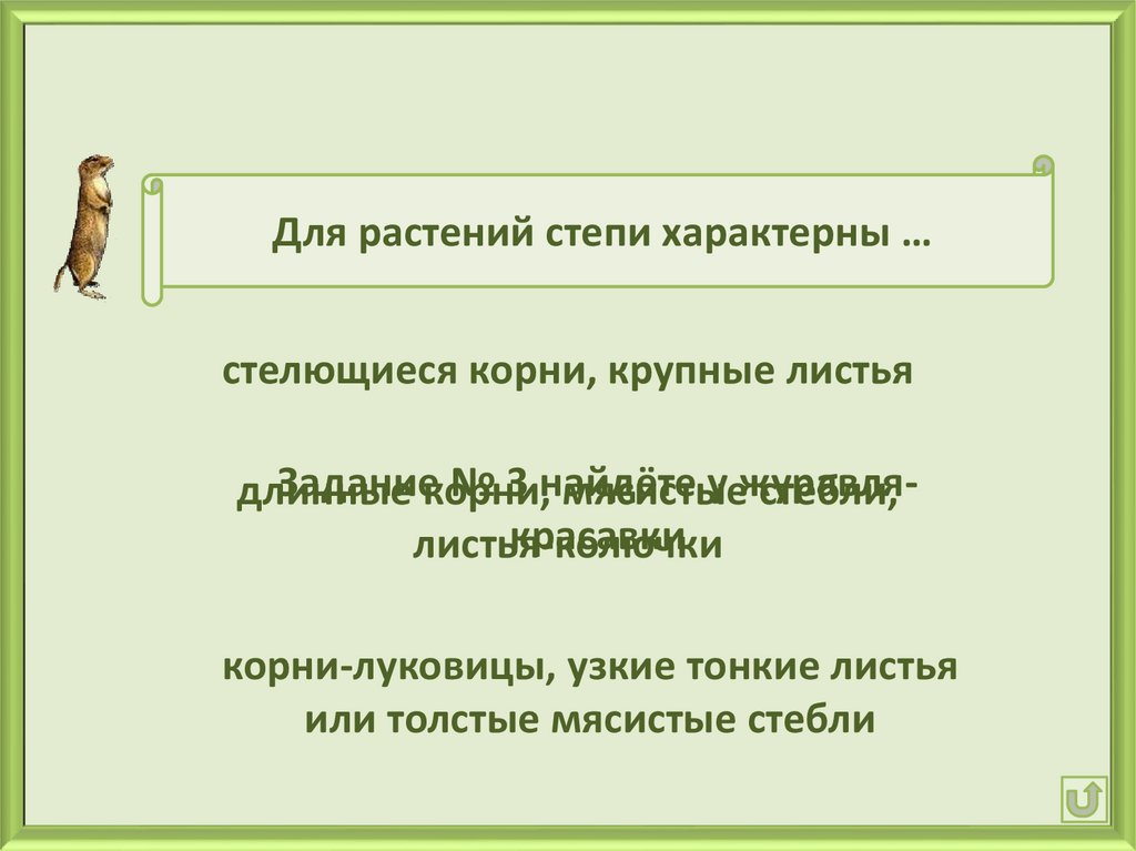 Для растений степи характерны …стелющиеся корни, крупные листья