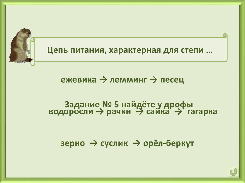 Цепь питания, характерная для степи …ежевика → лемминг → песец