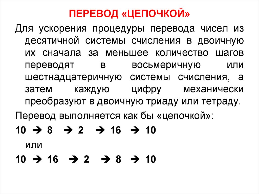 ПЕРЕВОД «ЦЕПОЧКОЙ»Для ускорения процедуры перевода чисел из