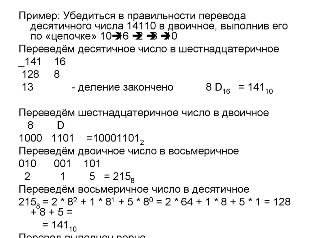 17. Пример: Убедиться в правильности перевода десятичного числа 14110 в двоичное, выполнив его по «цепочке» 10 è 8 è 2 è 16 è 10
