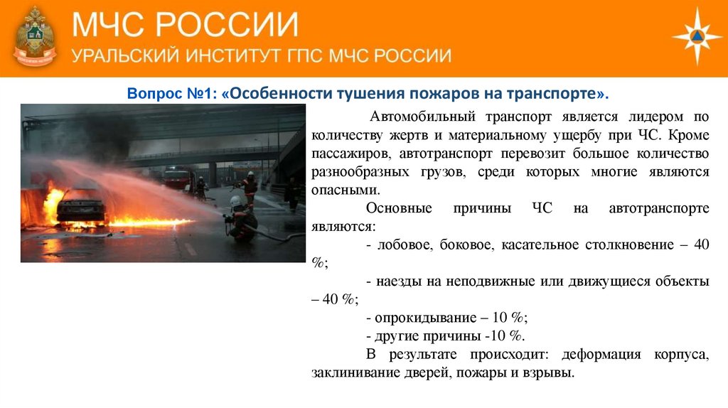 Вопрос №1: «Особенности тушения пожаров на транспорте».Автомобильный транспорт является лидером по