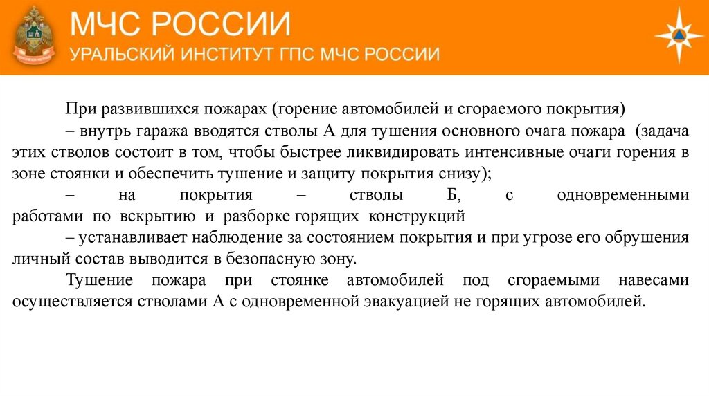 При развившихся пожарах (горение автомобилей и сгораемого покрытия)– внутрь гаража вводятся стволы А для тушения основного очага пожара (задача