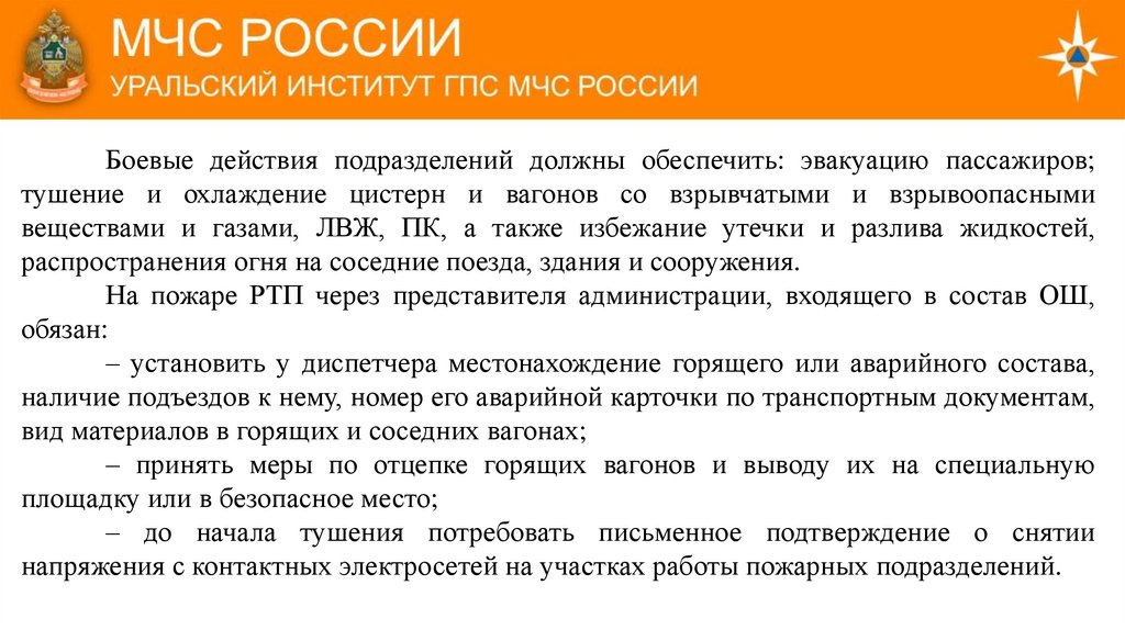 Боевые действия подразделений должны обеспечить: эвакуацию пассажиров;тушение и охлаждение цистерн и вагонов со взрывчатыми и взрывоопасными