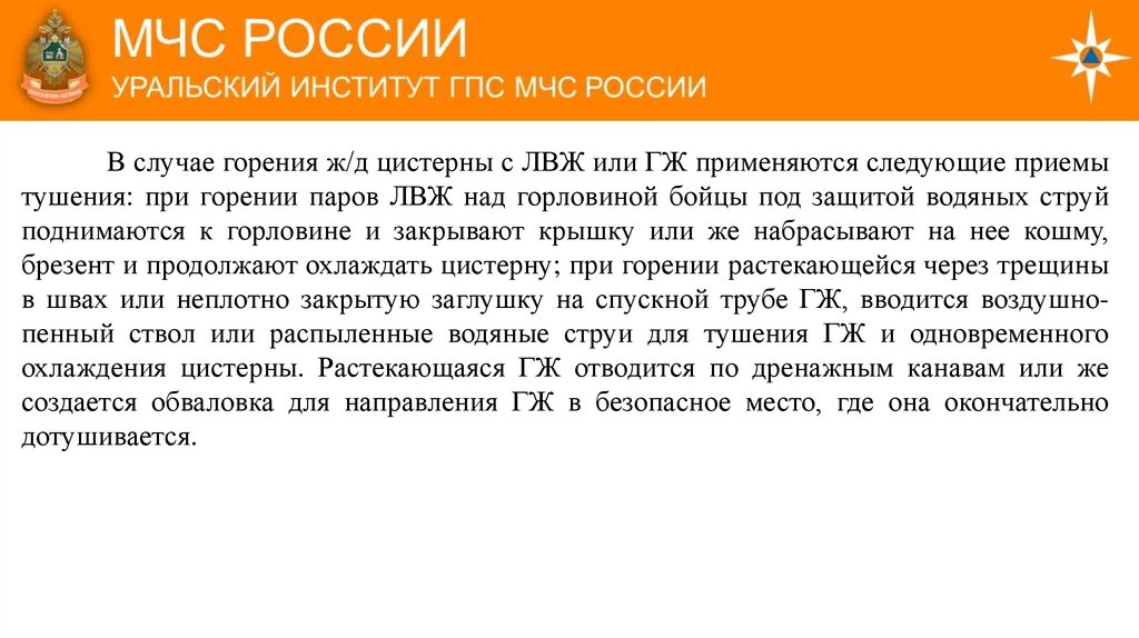 В случае горения ж/д цистерны с ЛВЖ или ГЖ применяются следующие приемытушения: при горении паров ЛВЖ над горловиной бойцы под защитой водяных струй
