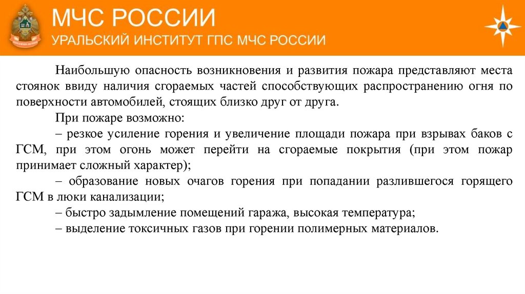 Наибольшую опасность возникновения и развития пожара представляют местастоянок ввиду наличия сгораемых частей способствующих распространению огня по