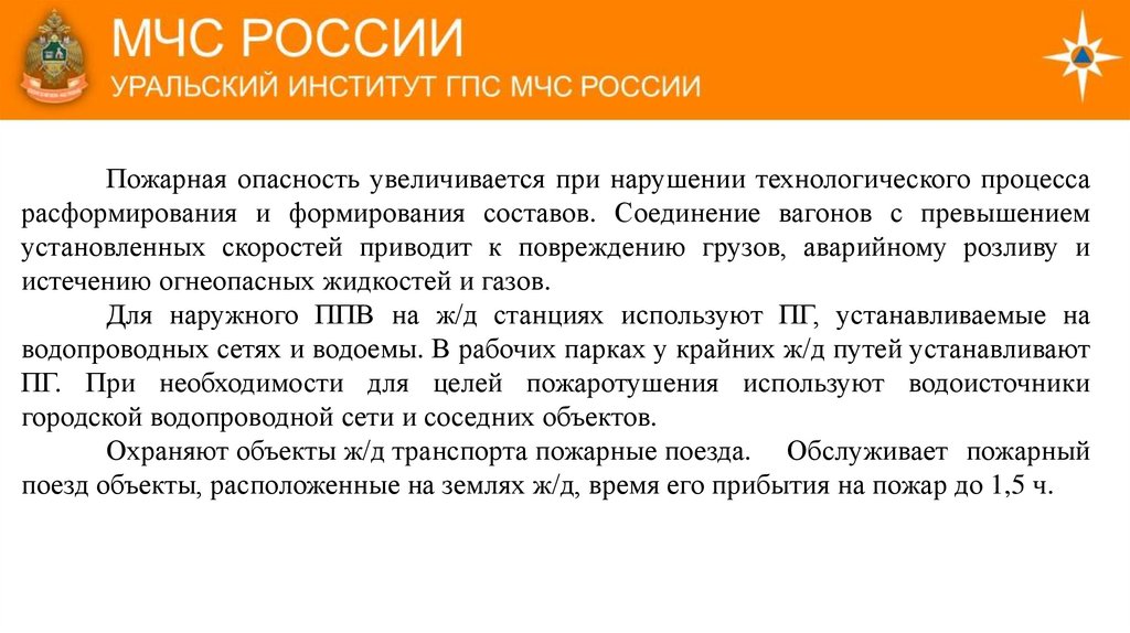 Пожарная опасность ж/д характеризуется:– наличием большого кол-ва единиц подвижного состава с различными