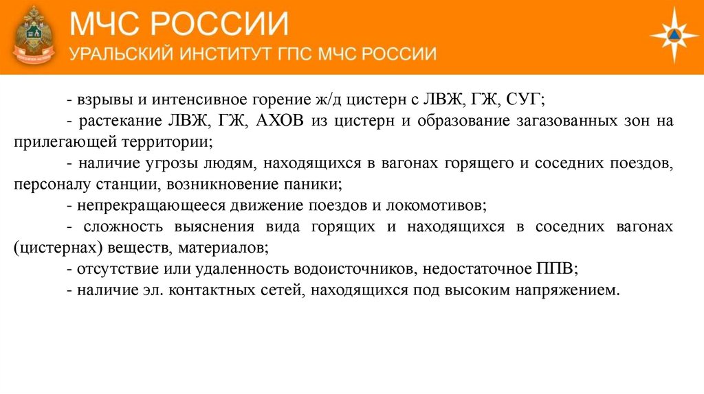 - взрывы и интенсивное горение ж/д цистерн с ЛВЖ, ГЖ, СУГ;- растекание ЛВЖ, ГЖ, АХОВ из цистерн и образование загазованных зон на