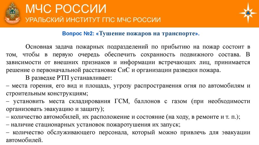 Вопрос №2: «Тушение пожаров на транспорте».Основная задача пожарных подразделений по прибытию на пожар состоит в