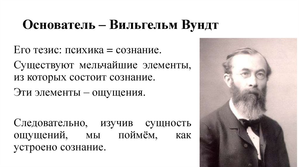 Основатель – Вильгельм ВундтЕго тезис: психика = сознание.