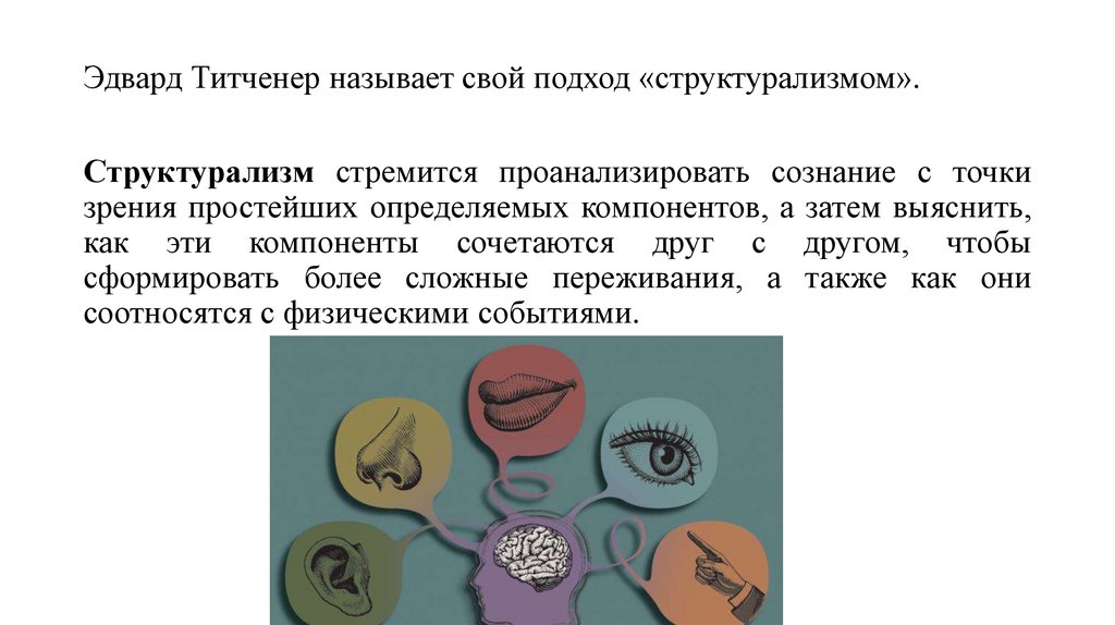 Эдвард Титченер называет свой подход «структурализмом».Структурализм стремится проанализировать сознание с точки