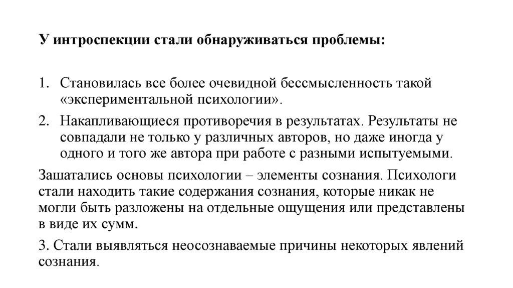 У интроспекции стали обнаруживаться проблемы:1. Становилась все более очевидной бессмысленность такой