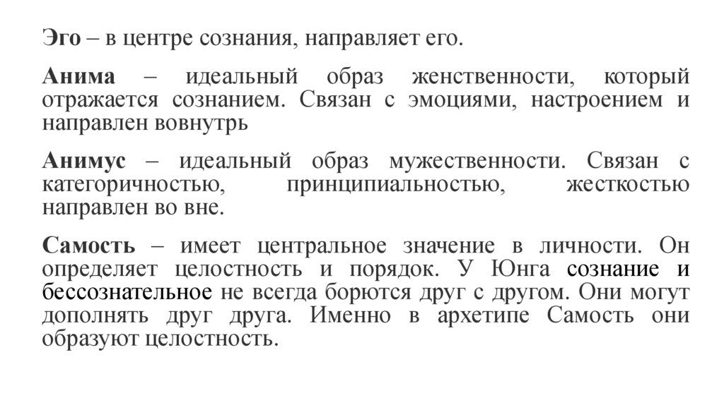 Эго – в центре сознания, направляет его.Анима – идеальный образ женственности, который