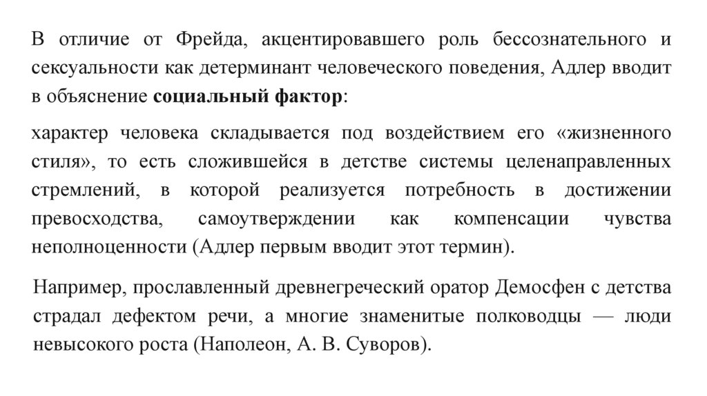 В отличие от Фрейда, акцентировавшего роль бессознательного исексуальности как детерминант человеческого поведения, Адлер вводит