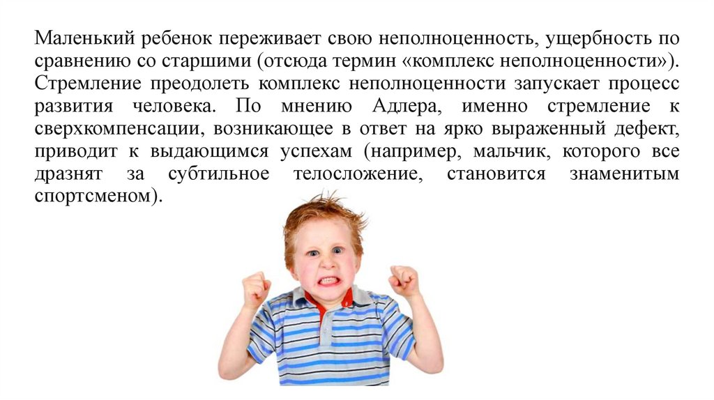 Маленький ребенок переживает свою неполноценность, ущербность посравнению со старшими (отсюда термин «комплекс неполноценности»).