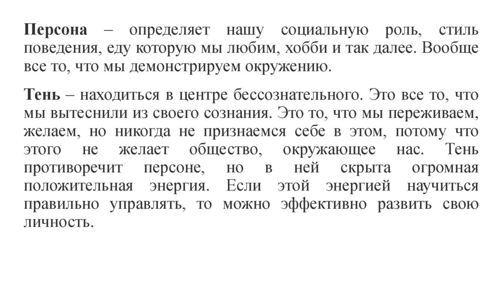 Персона – определяет нашу социальную роль, стильповедения, еду которую мы любим, хобби и так далее. Вообще