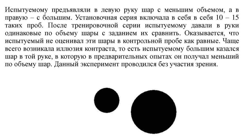 Испытуемому предъявляли в левую руку шар с меньшим объемом, а вправую – с большим. Установочная серия включала в себя в себя 10 – 15