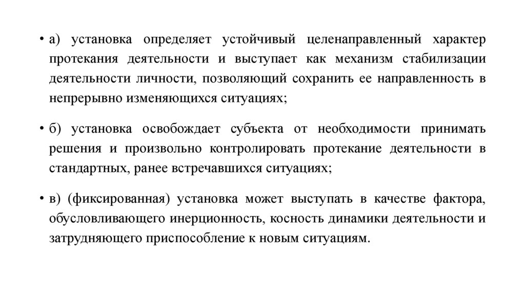 • а) установка определяет устойчивый целенаправленный характерпротекания деятельности и выступает как механизм стабилизации