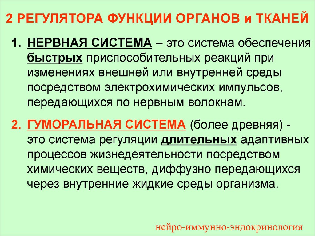 2 РЕГУЛЯТОРА ФУНКЦИИ ОРГАНОВ и ТКАНЕЙ1. НЕРВНАЯ СИСТЕМА – это система обеспечения
