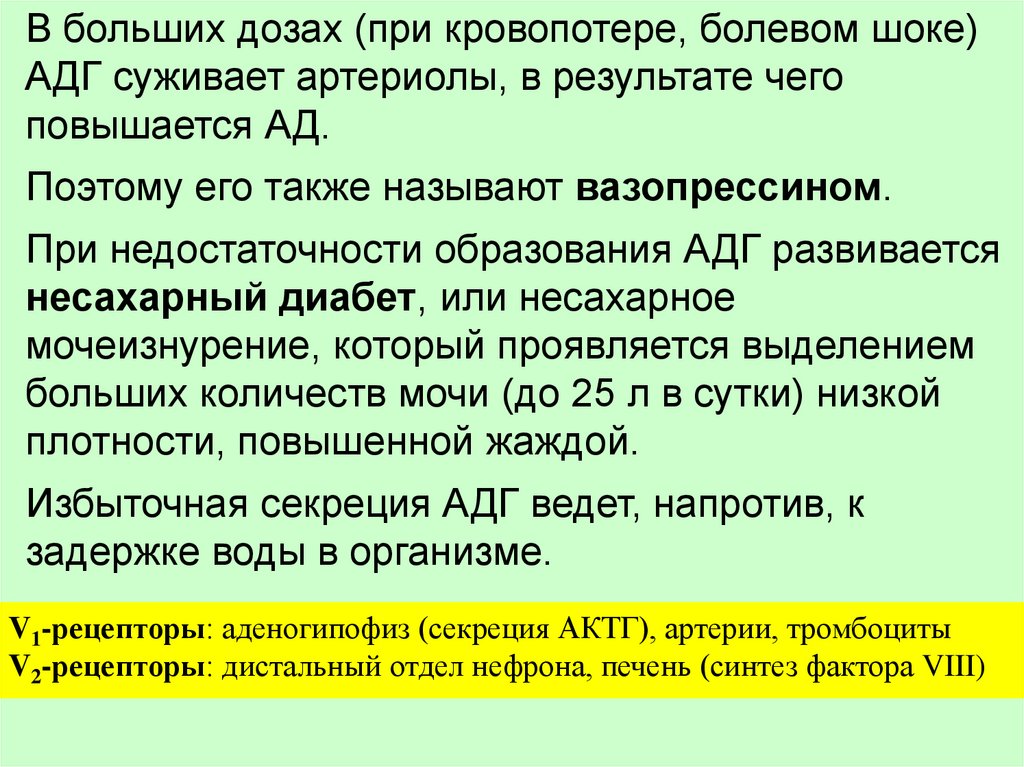 В больших дозах (при кровопотере, болевом шоке)АДГ суживает артериолы, в результате чего