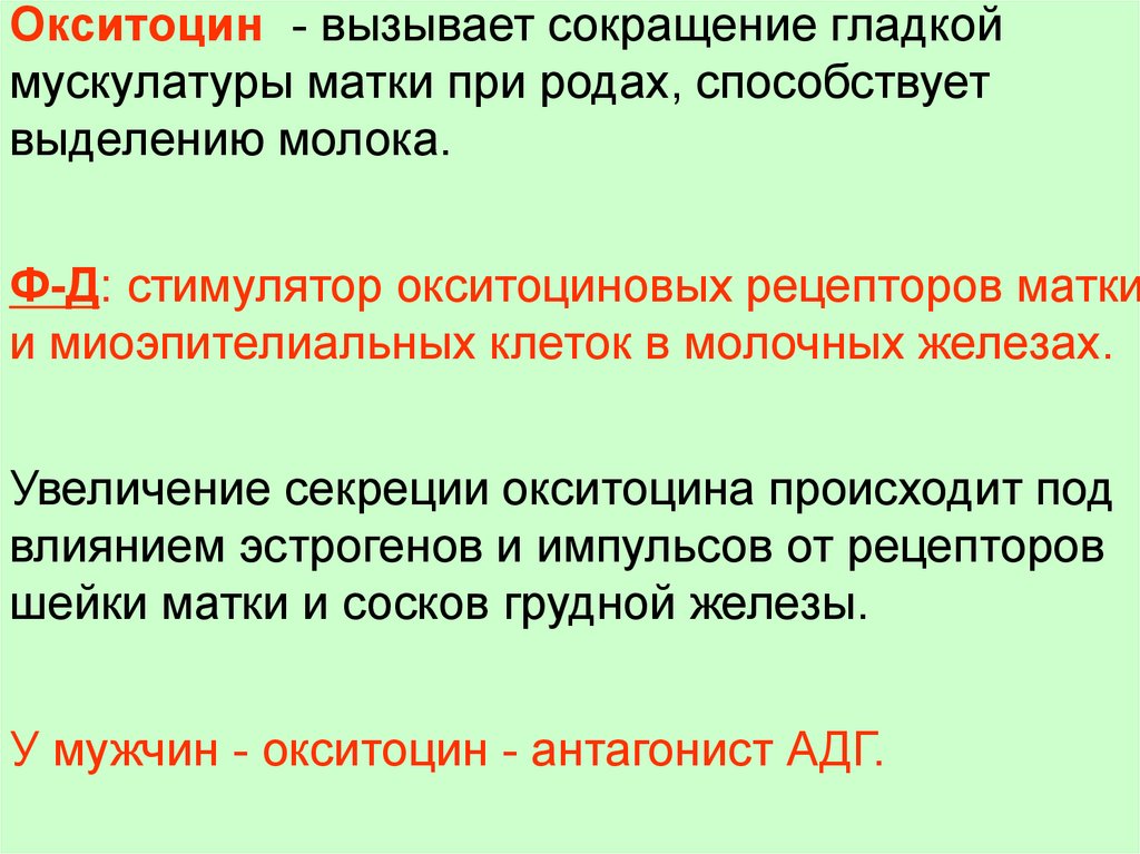 Окситоцин - вызывает сокращение гладкоймускулатуры матки при родах, способствует