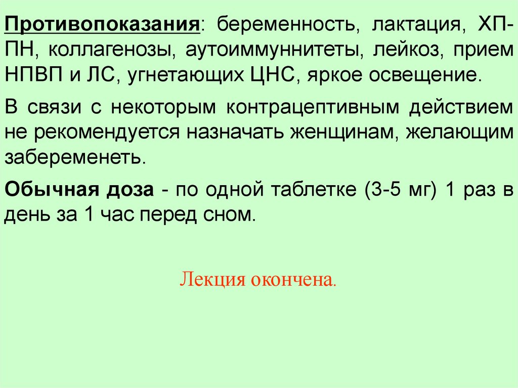 Противопоказания: беременность, лактация, ХППН, коллагенозы, аутоиммуннитеты, лейкоз, приемНПВП и ЛС, угнетающих ЦНС, яркое освещение.