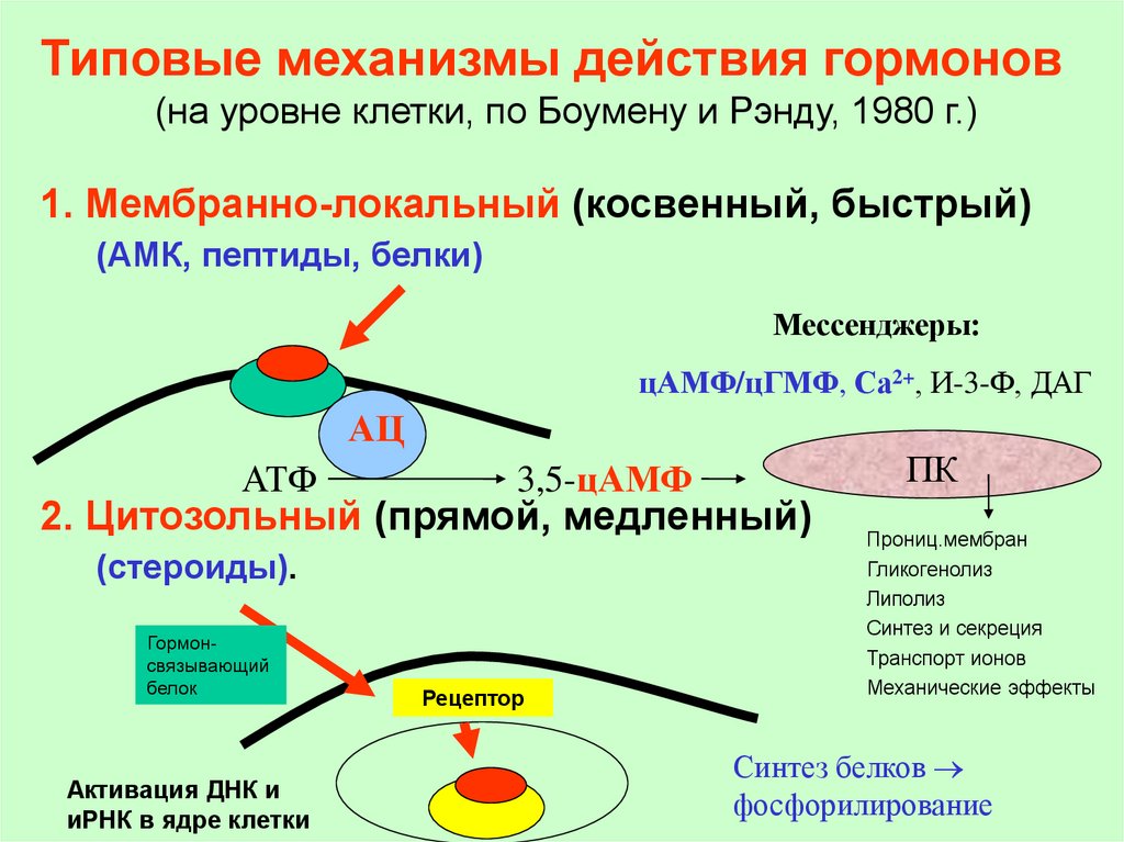 Типовые механизмы действия гормонов(на уровне клетки, по Боумену и Рэнду, 1980 г.)
