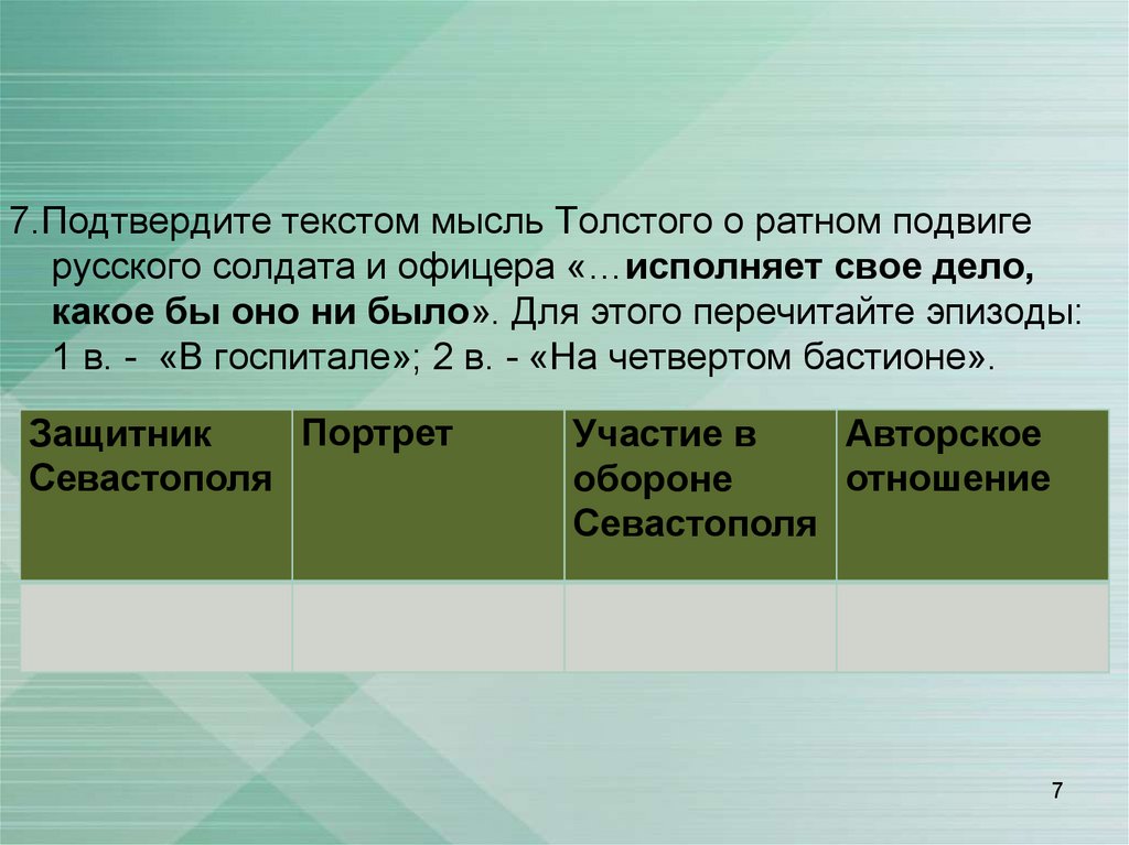 7.Подтвердите текстом мысль Толстого о ратном подвигерусского солдата и офицера «…исполняет свое дело,
