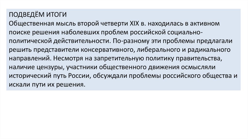 ПОДВЕДЁМ ИТОГИОбщественная мысль второй четверти XIX в. находилась в активном