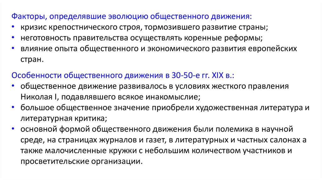 Факторы, определявшие эволюцию общественного движения:• кризис крепостнического строя, тормозившего развитие страны;