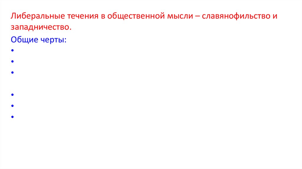 Либеральные течения в общественной мысли – славянофильство изападничество.