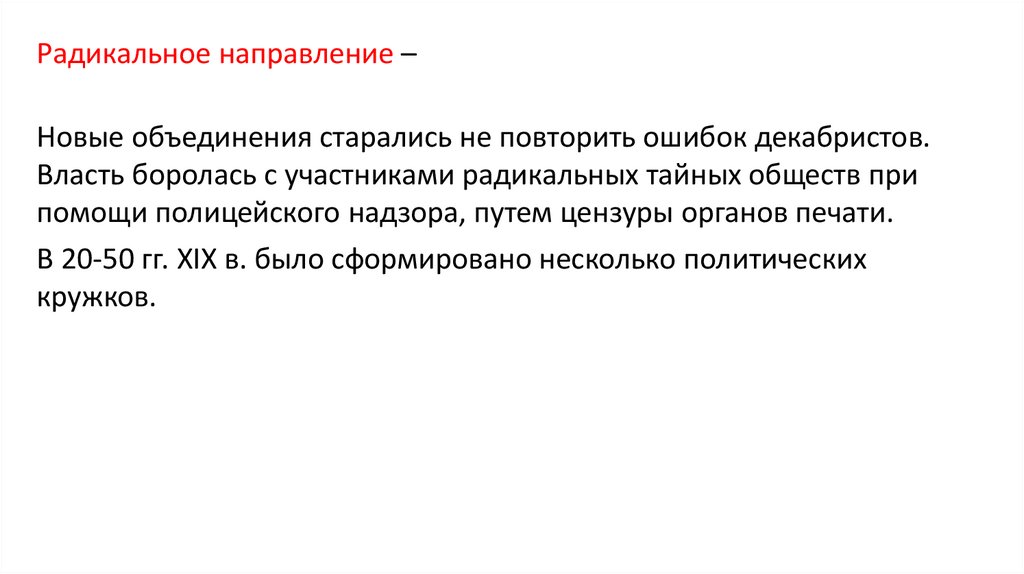 Радикальное направление –Новые объединения старались не повторить ошибок декабристов.