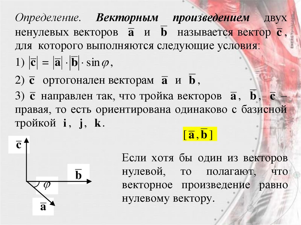 Определение. Векторным произведением двухненулевых векторов a и b называется вектор c ,