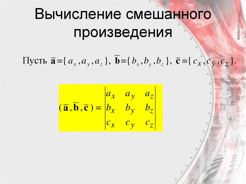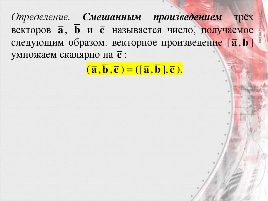Определение. Смешанным произведением трёхвекторов a , b и c называется число, получаемое