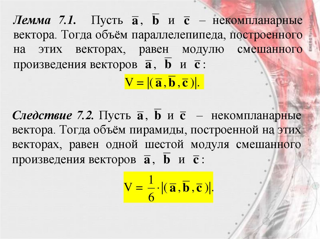 Лемма 7.1. Пусть a , b и c – некомпланарныевектора. Тогда объём параллелепипеда, построенного