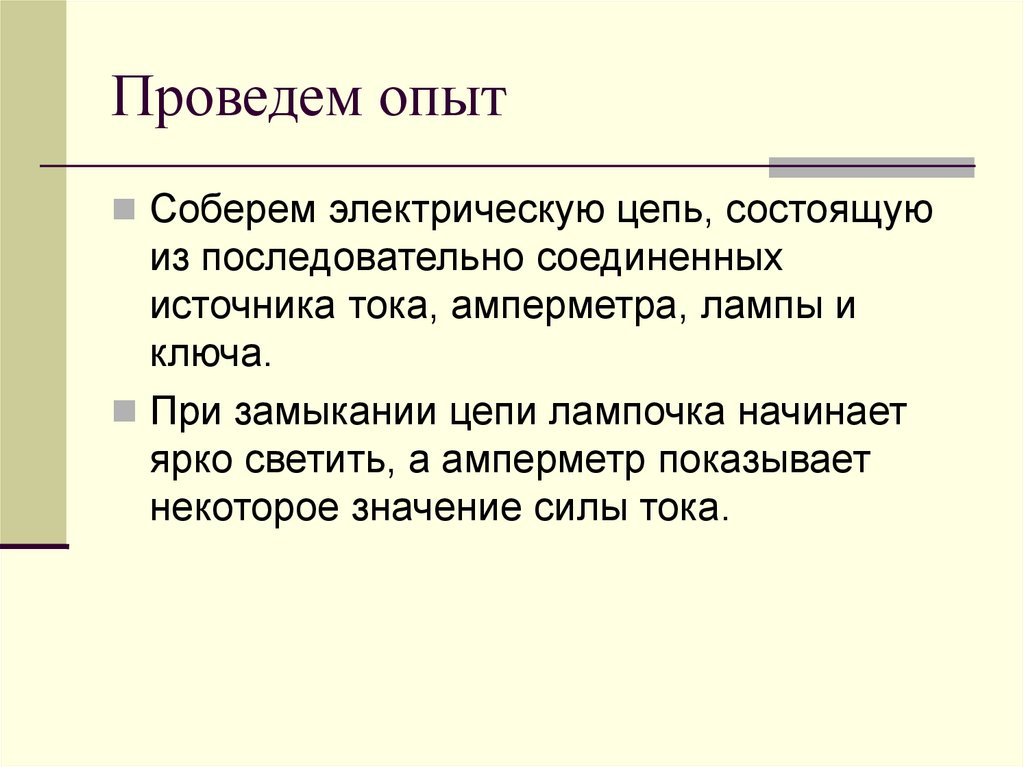 Проведем опытСоберем электрическую цепь, состоящую