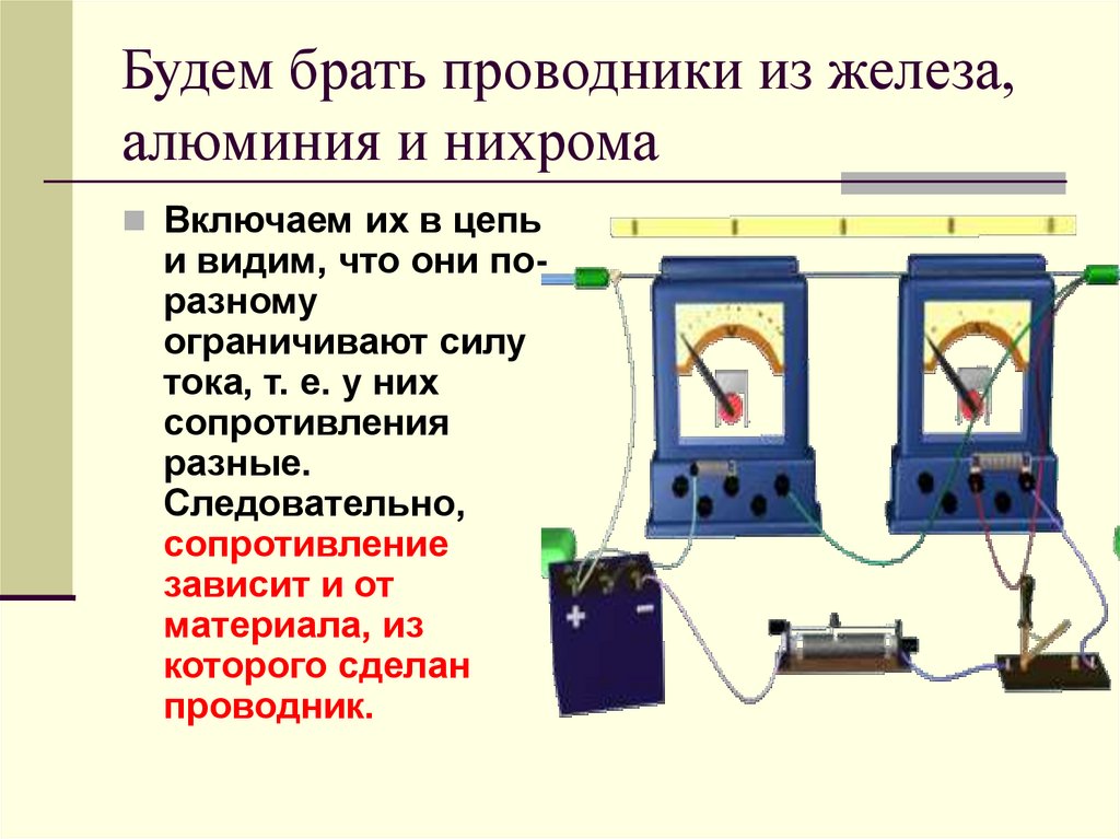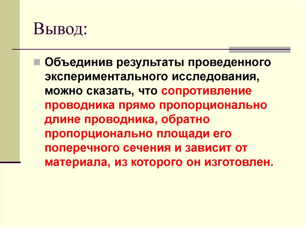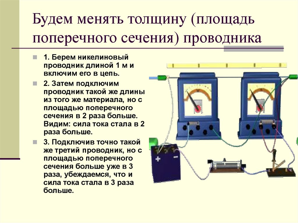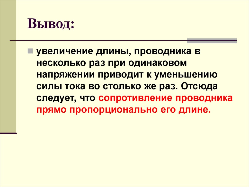 Будем изменять длину проводникаИзмеряем силу тока и