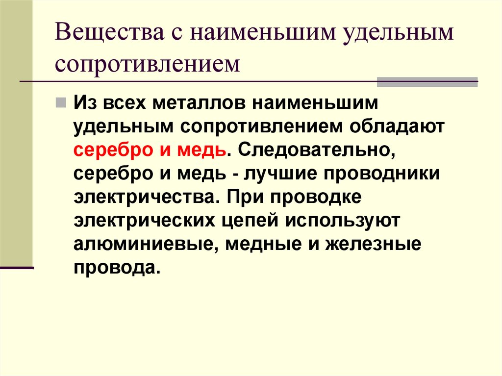 Вещества с наименьшим удельнымсопротивлением