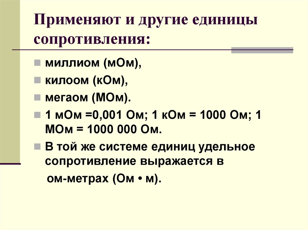 Применяют и другие единицысопротивления: