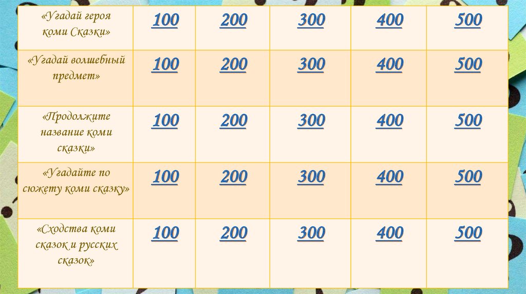 Ученики сами выбирают вопрос. Если ученики ответили правильно на вопрос, то они получают от 100-500 баллов