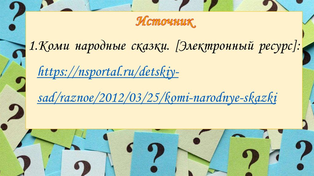 1.Коми народные сказки. [Электронный ресурс]:https://nsportal.ru/detskiysad/raznoe/2012/03/25/komi-narodnye-skazki
