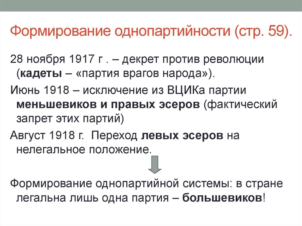 Формирование однопартийности (стр. 59).28 ноября 1917 г . – декрет против революции
